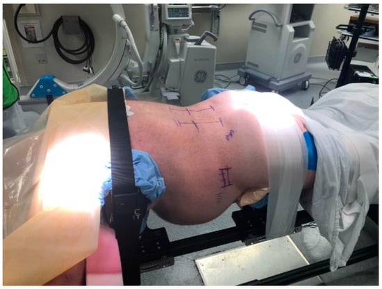 The surgical technique has been previously described by Pimenta et al., and our modified technique has been described by Wang et al. [,]. Patients undergoing prone lateral interbody fusion for deformity are positioned prone in an open Jackson frame with the arms in the “Superman” position, the lower extremities extended, and the abdomen hanging freely. Under fluoroscopy, the length of the disk space is marked, and the posterior incision is planned as per surgeon’s preference. We use real-time virtual live fluoroscopy (TrackX Technology, Hillsborough, NC, USA) for instrument guidance and confirm implant and instrumentation placement with intraoperative CT. The detailed patient positioning is shown in Figure 1.
