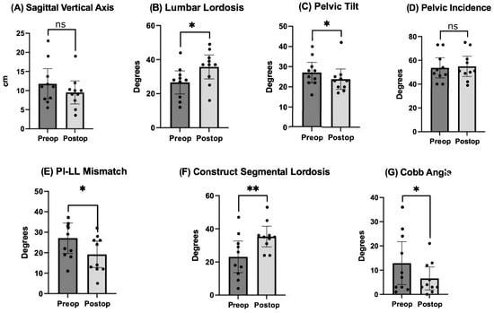 Comparison of pre- and postoperative radiographic outcomes of spinopelvic parameters. Undergoing prone lateral deformity surgery was associated with significant improvements in lumbar lordosis, pelvic tilt, PI-LL mismatch, SL across the construct, and coronal Cobb angle. * = p < 0.5, ** = p < 0.01, ns = nonsignificant.