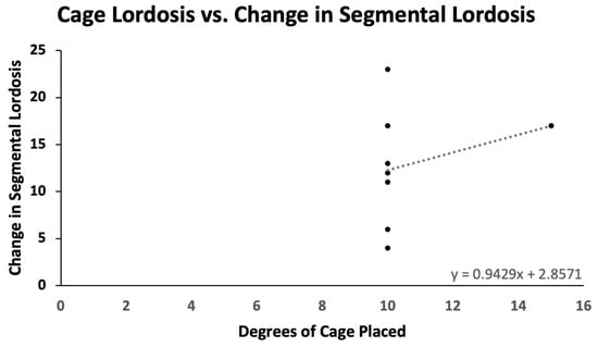 Cage lordosis versus change in segmental lordosis. For every additional degree of cage placed, there is an average gain of 0.943° in segmental lordosis.