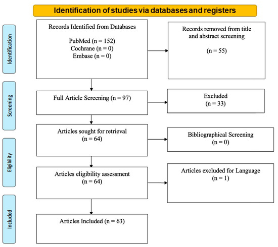 Over 152 studies meeting the inclusion criteria were identified. Fifty-five studies were outside the scope of malignant endometriosis and were therefore excluded. Thirty-three were excluded due to limited reported evidence, and one was excluded because of the language (Spanish). A total of 63 articles remained after elaborating bibliographical search screening. Cochrane and Embase databases did not produce any search results (Figure 1). No library filters or limits were applied. The extracted studies were exported from the medical libraries as .txt files and consecutively analyzed by being re-imported into an excel file. Data collection was carried out manually and independently with the help of three reviewers (Supplementary Table S1).