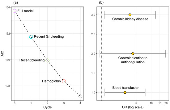 Figure 1a shows a stepwise backward/forward regression, which led to the selection of the following variables at the end of the minimization runs: CKD, blood transfusion, and contraindication to anticoagulation. Figure 1b shows the ORs and the corresponding confidence intervals for the selected variables.