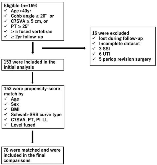 - Yagi, M.; Fujita, N.; Okada, E.; Tsuji, O.; Nagoshi, N.; Asazuma, T.; Watanabe, K. Clinical outcomes, complications and cost-effectiveness in surgically treated adult spinal deformity over 70-years -A propensity-score matched analysis. Clin. Spine Surg. 2020, 33, E14–E20. [Google Scholar] [CrossRef] [PubMed]
