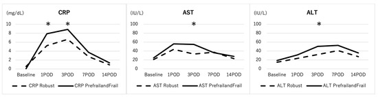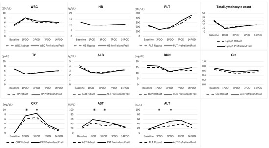 3.2. Comparisons of Baseline and Post-Operative Laboratory Data between the Robust Group and Prefrail/Frail Group