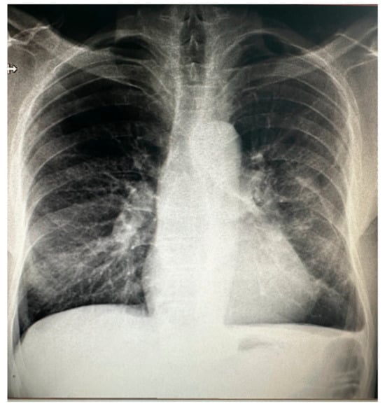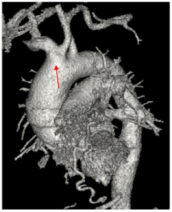 A 61-year-old male active smoker was referred to our center from a tertiary center for dilatation of the ascending aorta based on chest computed tomography (CT). His medical history was unremarkable, except for rare episodes of nonspecific thoracic pain. At admission, physical examination was within normal limits, he was hemodynamically stable with a systolic blood pressure of 120–140 mmHg on both hands and an 86-bpm regular pulse with normal peripheric pulses. Pulse oximetry revealed 98–99% oxygen saturation. EKG showed normal sinus rhythm with signs of left ventricular hypertrophy. Blood work showed only a mild renal dysfunction (serum creatinine 1.31 mg/dL, blood urea nitrogen 58 mg/dL). In a postero-anterior chest X-ray, the heart silhouette appeared enlarged, consistent with cardiomegaly, and both hilar regions appeared enlarged, with vascular appearance (Figure 1). Transthoracic echocardiography (TTE) showed the following diameters: aortic annulus of 26 mm, root diameter of 51 mm at the level of Valsalva sinuses, 54 mm for the ascending aorta, 44 mm aortic arch, and descending aorta of 35 mm. The left ventricle was concentrically hypertrophied with a systolic/diastolic diameter of 44/23 mm with normal global and regional function, the estimated left ventricular ejection fraction was 60%, and the right ventricle had a diameter of 27 mm and normal function. Aortic valve analysis showed a tricuspid aortic valve with mild regurgitation and mild mitral, tricuspid, and pulmonary valve regurgitations. No signs of aortic dissection were present, and no pericardial effusion was observed. Left and right atria were mildly dilated. Contrast chest CT (Figure 2A,B) measured the following diameters: aortic root of 60 mm at the level of aortic sinuses, asymmetric dilatation of the noncoronary sinus, 49 mm at the sino-tubular junction, ascending aorta of 57 mm, aortic arch 35 mm, and descending thoracic aorta 30 mm. A bovine aortic arch with the common origin of the innominate artery and left carotid artery was present (Figure 3). Also, the patient had signs of a recent right peripheral pulmonary embolism. A pneumological consult identified an older left peripheral pulmonary embolism and recommended only a follow-up chest CT at 3 months. To determine a possible cause of the pulmonary embolism, abdominal and pelvic contrast CT was obtained with no signs of neoplasia, or other pathological findings and upper gastrointestinal endoscopy was normal. Thrombophilia tests were performed: ATIII was 69% less than 83% normal value, APS was 1.22 slightly elevated, protein C and S had normal values, and lupus and anticardiolipin antibodies and anti beta2glicoprotein had normal values.