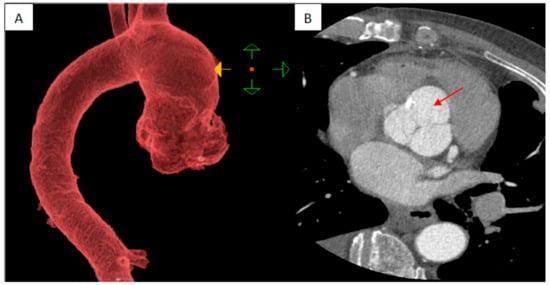 Preoperative contrast chest CT. (A) Reconstruction of ascending aorta and root. (B) The transverse plane at the level of the aortic sinuses shows an enlarged aortic root with the predominance of non-coronary sinus dilatation (arrow).