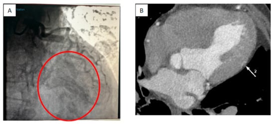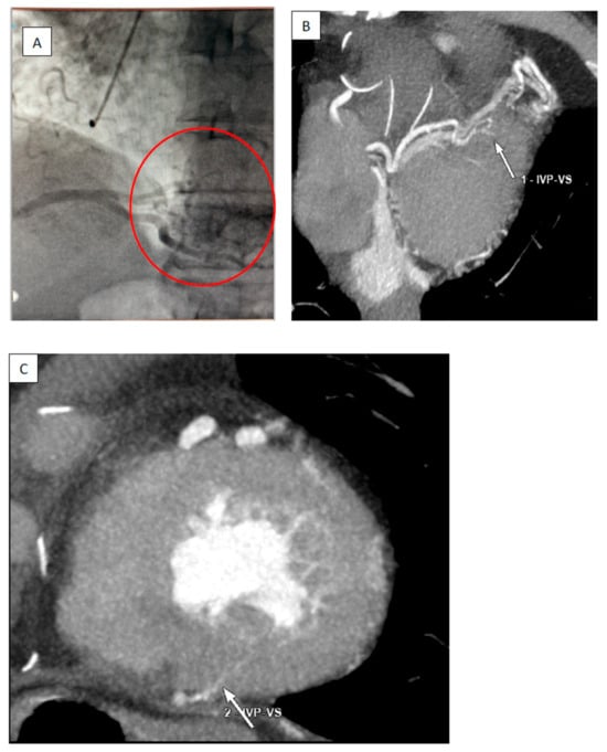 Congenital coronary artery fistulas (CAFs) are a direct communication of the epicardial coronary artery with one of the four cardiac chambers (coronary cameral fistulas—CCFs) or major vessels of the heart or chest (coronary arteriovenous fistulas) []. Incidence is 0.002% in the general population [] and multiple coronary fistulas are found in 5% of cases []. CARs draining into the left ventricle are even more rare, most of them draining into the low-pressure right chambers []. Most of the CAFs are asymptomatic and can become symptomatic in the fifth or sixth decade of life []. While there is a diversity of nonspecific symptoms described in the literature like angina, dyspnea, palpitations, and syncope, CAFs can lead to more serious complications like myocardial ischemia, infective endocarditis, and heart failure [,,]. When diagnosed, CAFs are usually solitary but can be associated with congenital cardiac anomalies like ventricular septal defect and tetralogy of Fallot []. Symptomatic CAFs can be managed either with direct surgical ligation with or without coronary bypass or with a variety of interventional methods (occluder devices, coils) [].