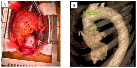 (A) Intraoperative view showing ascending aorta replacement and reconstruction of the non-coronary sinus with a Dacron patch and a dilated right coronary artery (arrow); (B) postoperative contrast chest CT reconstruction of the ascending aorta with a 40.6 mm diameter of the ascending aorta at the level of the sino-tubular junction and a 43.6 mm diameter of the proximal aortic arch.