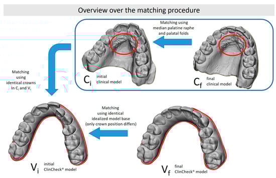 Since both models Vi and Ci must be identical due to production before active treatment without any tooth movement being conducted, the teeth of Ci and Vi could be aligned via a surface–surface matching algorithm [], overlaying the unmoved teeth of the initial situation and the ClinCheck®, respectively, according to the principle of distance minimizing.
