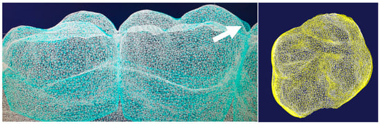 The left-sided figure presents a satisfactory overlay of the Ci (cyan) and Vi (white) models in wireframe view. However, the discrepancy at the mesial cusp of the first molar (arrow) has to be noted, which is probably due to an impression error. The right-hand figure shows a perfect superimposition of tooth 26, visible on matching yellow and white nodes with congruent contours from every angle.
