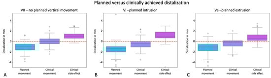 Effectiveness of distalization visualized in the y-axes of the graphs in mm for the groups V0 = exclusive distalization (A), Vi = distalization plus planned intrusion (B), and Ve = distalization plus planned extrusion (C). Values with a positive sign stand for mesial movements; values with a negative sign stand for distal movements. The boxplots visualize the planned movement, the clinically implemented movement, and the deviation resulting from these two boxplots as a side effect in a third boxplot. Dots represent outliers. The red line marks zero translational movement.