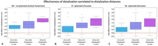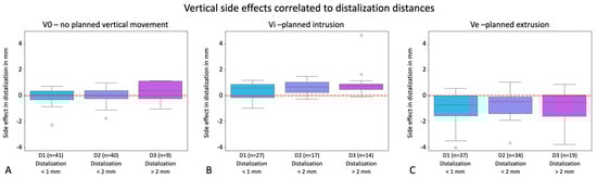 Potential for unwanted vertical side effects occurring during distalization correlated with distalization distances visualized in the y-axes of the graphs in mm for the groups V0 = exclusive distalization (A), Vi = distalization plus planned intrusion (B), and Ve = distalization plus planned extrusion (C). Values with a positive sign stand for extrusion; values with a negative sign stand for intrusion. The boxplots show the clinical side effects resulting from the discrepancies between planned and clinically achieved movements. Dots represent outliers. Boxplots exhibit the side effects for the groupings D1 (<1 mm distalization), D2 (>1–2 mm distalization), and D3 (>2 mm distalization). In the right-hand bar charts, the number of individual teeth in each group is visualized. The red line marks zero vertical movement.