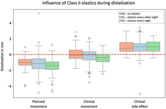 Effectiveness of distalization in relation to wearing elastics, visualized in the y-axis of the graph in mm for the groups E0 = no elastics, E1 = elastics every other night, and E2 = elastics every night. Values with a positive sign stand for mesial movements; values with a negative sign stand for distal movements. The boxplots show the planned movement, the clinically implemented movement, and the deviation resulting from these two boxplots as a side effect in a third boxplot shown together for all groupings. Dots represent outliers. The red line marks zero translational movement.