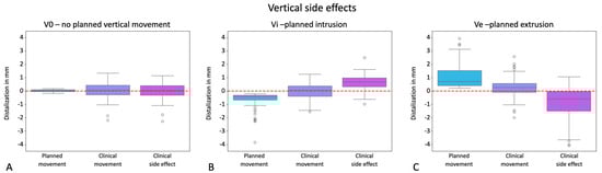 Potential for unwanted vertical side effects occurring during distalization, visualized in the y-axes of the graphs in mm for the groups V0 = exclusive distalization (A), Vi = distalization plus planned intrusion (B), and Ve = distalization plus planned extrusion (C). Values with a positive sign stand for extrusion; values with a negative sign stand for intrusion. The boxplots visualize the planned movement, the clinically implemented movement, and the deviation resulting from these two boxplots as a side effect in a third boxplot. Dots represent outliers. The red line marks zero vertical movement.