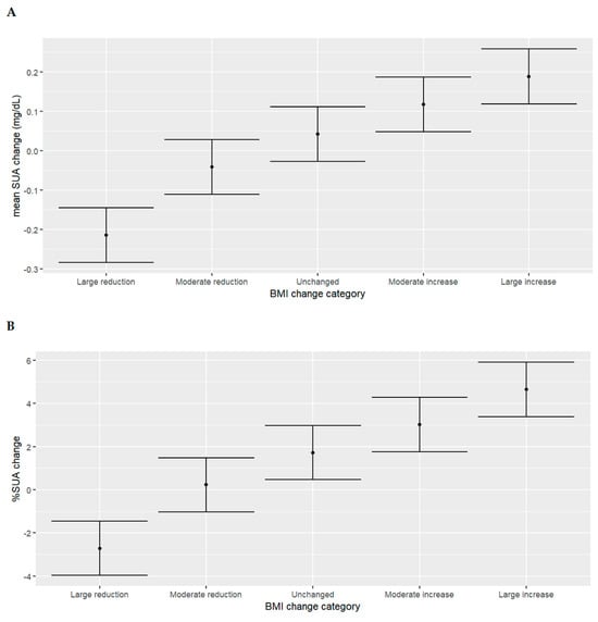 Mean serum uric acid change ((A)—mg/dL, (B)—percentage) according to the pre-specified BMI change groups. The black dots represent mean serum uric acid change (mg/dL or percentage); bars represent standard deviation. Abbreviations: BMI, body mass index; SUA, serum uric acid.