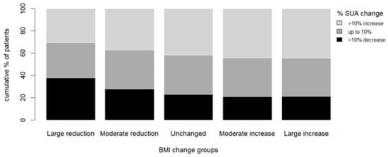The proportion of patients with at least a 10% increase in serum uric acid increased with the relative change in BMI (17.3%, 20.8%, 23.4%, 27.5%, and 33.1% for “large reduction”, “moderate reduction”, “unchanged”, “moderate increase”, and “large increase” groups, respectively (p < 0.01)). Comparably, the proportion of patients with at least a 10% decrease in serum uric acid decreased with the relative change in BMI (31.2%, 22%, 17.6%, 15.2%, and 14.2% for “large reduction”, “moderate reduction”, “unchanged”, “moderate increase”, and “large increase”, respectively (p < 0.01)) (Figure 2).