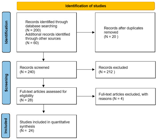 A total of 260 studies were found when the search results from all databases were combined. Twenty studies were duplicates so they were removed. After screening the title and abstract, a total of 212 investigations were eliminated. After reading the complete text, four studies were eliminated (two because they did not look at the link between genetic variants and ACL ruptures and two because they were not written in full). In the end, 24 publications were included in this systematic review. Figure 1 depicts a flowchart of this procedure.
