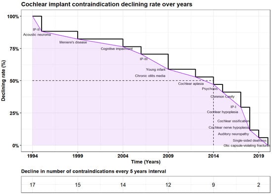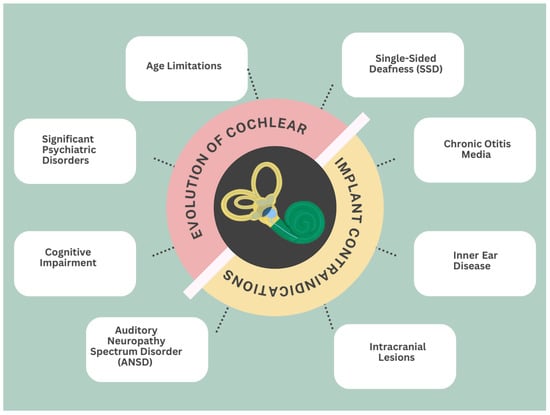 This narrative review offers a comprehensive examination of the chronological contraindications linked to CI, emphasizing the evolving perspectives over time (Table 1, Figure 1 and Figure 2). Nevertheless, some conditions, notably untreated intracranial lesions, still stand as contraindications for CI. The reevaluation of contraindications has opened new possibilities and expanded indications for cochlear implantation. Emerging prospects and advantages, such as improved outcomes and enhanced quality of life, offer hope for individuals with profound SNHL. As the field continues to advance, collaborative efforts among clinicians, researchers, and policymakers are crucial to further refine and optimize the decision-making process in cochlear implantation. Ensuring adherence to stringent criteria for CI eligibility is imperative to mitigate complications and optimize outcomes. While CI devices may not entirely restore normal hearing, they serve as pivotal tools in auditory rehabilitation, significantly augmenting recipients’ hearing capabilities and overall quality of life.