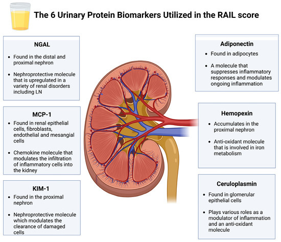 In contrast, the other four biomarkers incorporated in the RAIL score were identified using unbiased discovery proteomics techniques, such as mass spectrometry. Four primary proteomic discovery studies pioneered the identification of novel urinary biomarkers in the context of LN [77,78,79,80,81]. These studies compared urine proteomic signatures across approximately 300 patients with LN and controls. They identified ~30 target proteins through the utilization of techniques such as surface-enhanced laser desorption–ionization time-of-flight mass spectrometry (SELDI-TOF) and matrix-assisted laser desorption–ionization time-of-flight mass spectrometry (MALDI-TOF-MS/MS). Identified proteins were then validated in further targeted proteomics studies utilizing ELISA techniques [81,82,83,84]. Subsequently, four of these proteins were selected in the RAIL score, including ceruloplasmin, adiponectin, hemopexin, and kidney injury molecule-1 (KIM-1). Mechanistically, hemopexin and ceruloplasmin represent antioxidant proteins that are increased in subjects with LN, potentially as an indicator of ongoing inflammation [85,86]. Furthermore, KIM-1 is in the nephron and is upregulated during kidney damage to facilitate the clearance of damaged cells [87,88]. Finally, adiponectin suppresses inflammation that can be upregulated in patients with LN [89]. Figure 2 provides an illustrative demonstration of the RAIL biomarkers and their function in the kidney. Importantly, proteins such as NGAL and KIM-1 are not specific for LN and reflect kidney injury secondary to a variety of causes (reviewed here: [90]).