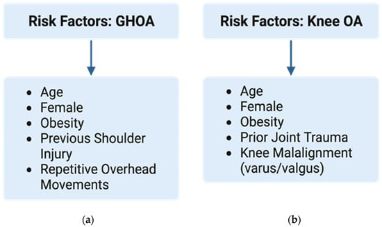 (a) Risk factors for glenohumeral OA and (b) risk factors for knee OA. Created with BioRender.com.
