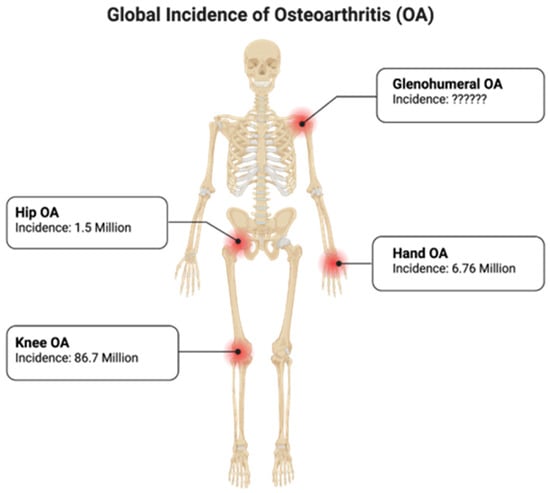Global incidence of osteoarthritis in the knee, hip, hand, and shoulder joints in the United States. Created with BioRender.com.