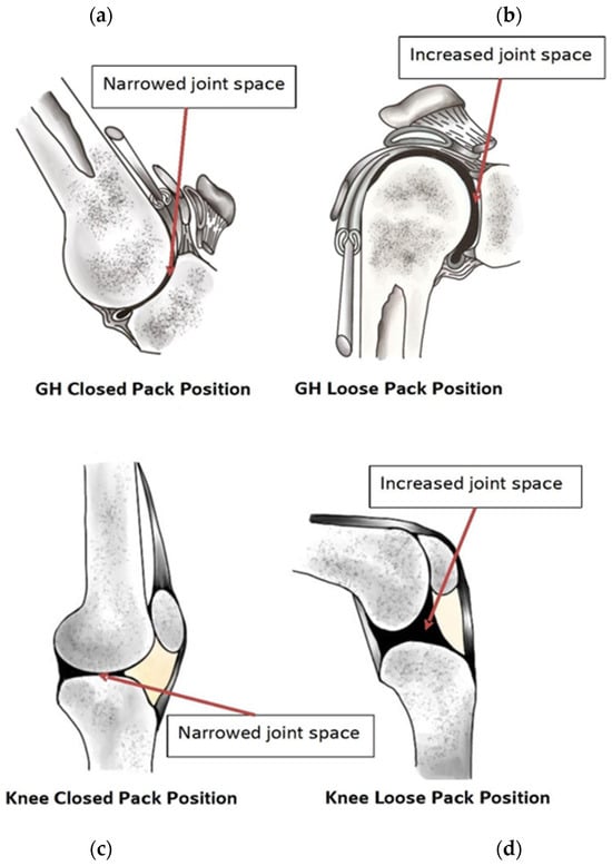 Joints experience degradation either following a traumatic event or from wear and tear over a lifetime. Traumatic damage to the cartilage initiates and propagates a cascade of additional harm, eventually resulting in the development of OA [51,52]. To incur wear and tear damage, the joint surfaces must come close enough to exert force on the cartilage of the opposing bone surface. Maximum proximity of a joint surface is exhibited in a closed-pack position (CPP), indicating the highest level of surface congruency [53] (Figure 4a,c). Contrary to a CPP is a maximally loose-packed position (MLPP); the MLPP refers to the bones when they are at their maximum distance from each other, thereby reducing shear forces within the joint (Figure 4b,d). As the joint moves away from an MLPP toward a CPP, the bones of the joint draw closer together, narrowing the joint space and increasing shear forces within the joint.