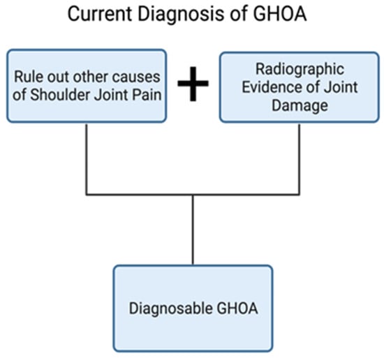 Unlike OA of the knee, hip, or hand, which all have well-defined radiographic diagnostic pathways [54,55,56], GHOA does not have an agreed-upon criteria for diagnosis, and because of this, accurately defining GHOA is difficult [10,29,57,58]. Currently, diagnosis of GHOA relies on assessing symptomatic pain and radiological evidence of joint damage, such as glenohumeral joint space narrowing, osteophyte formation, cyst formation, and subchondral sclerosis [5] (Figure 5). These criteria imply that the diagnosis of GHOA is only possible in the advanced stages of the disease.