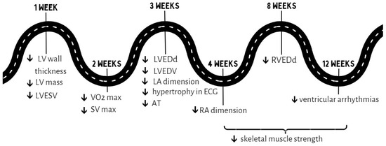 The physiological effects of detraining seem to appear earlier than most morphological changes [17]. Detraining for 3 weeks by endurance athletes may result in a decrease in maximum oxygen uptake (VO2 max) [6,7] and stroke volume (SV) [6] but generally has no significant impact on the ejection fraction and diastolic function [5,7]. Interestingly, there is some information about an increase in the ejection fraction after detraining [8], which may be explained by a slightly lower ejection fraction in athletes at rest. Studies on young male endurance athletes suggested a significant decrease in physical performance even in a shorter period of 2–4 weeks, as detraining resulted in a 6–7.5% decrease in VO2 max [18,19,20,21], 12% decrease in SV max [18] and 14% decrease in the anaerobic threshold (AT) [20], with a significant correlation between these parameters and VO2 max [18,19,20]. Further observation after 8–9 weeks showed a VO2 max that was reduced by 11–16% [20,21] and an AT that was almost 20% lower [20]. However, both the absolute VO2 max and the AT did not return to the levels that were measured before training, even after 8–9 weeks [20,21]. No further decline in VO2 max was observed after inactivity of longer than 3 months [22]. The values of SV finally returned to the level of the control group, but muscle capillarization and oxidative enzyme activity still remained increased [21]. In long-term detraining, a significantly greater tendency towards reduction in VO2 max was observed in young athletes <20 years old and individuals with higher VO2 max values before training cessation than in those of older ages and with lower fitness levels. After a short period of inactivity (<30 days), the decrease in VO2 max was independent of age and previous fitness level [22]. Partial reduction in physical activity has a smaller impact on the withdrawal of adaptive changes than complete inactivity but only in long-term detraining. Not completely ceasing training can allow athletes to maintain a certain level of physical performance when they have to limit physical activity for more than one month [22]. However, the type of physical activity during incomplete detraining had an important impact on athletes’ performance. A large influence on preserving fitness levels, even after 2 weeks, has been demonstrated for high-intensity physical effort, without the necessity to maintain training volume [22,23,24]. We propose a scheme with the earliest time of withdrawal of adaptive changes according to available research on healthy athletes (Figure 2).