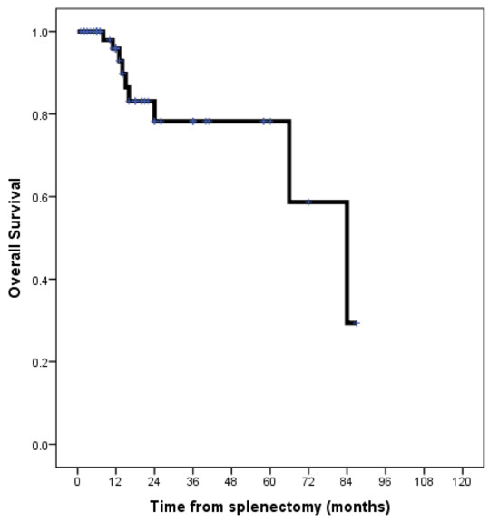 Kaplan–Meier survival curve estimating the overall survival in 70 patients with splenectomies for splenic metastases of colorectal cancer origin.