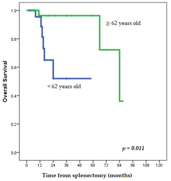 Similar results (as in the studies mentioned above) were obtained in the present study, except for age. Thus, in the present study, patients younger than 62 years presented statistically significantly worse overall survival rates after splenectomies for SM of CRC origin than those ≥62 years (p = 0.011), as shown in Table 4 and Figure 2. Younger ages were previously associated with worse survival also after hepatectomies for liver metastases of CRC origin in a study [126]. Conversely, another study associated age < 65 years with better overall survival after resectioning liver and lung metastases of CRC origin [127].