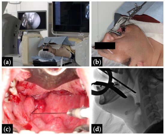 Fluoroscopy- and endoscopy-guided transoral sclerotherapy: (a) treatment position with monitors depicting the fluoroscopy (right) and the endoscopy (left); (b) Patient 10 positioned head tilt–chin lift with a Dott mouth gag and a tongue blade, and intubated via a tracheostomy; (c) endoscopic view with the pharyngeal lesion punctured by an angled angiocatheter; and (d) intraoperative fluoroscopic view.