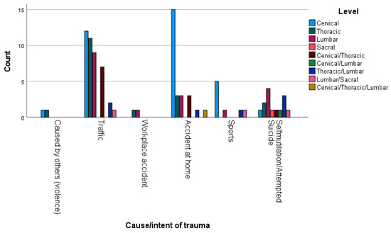 Traffic accidents were the type of trauma that contributed the most to spinal column injury in children, followed by accidents at home. This is similar to other studies showing traffic accidents, sports, and accidents at home as the most likely causes [4,6,22].