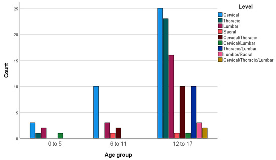 Most injuries to the spinal column occurred in the 12–17-year-old age group, with 79.8%, which is in line with earlier research regarding this topic [1,3,12]. The incidence of spinal column injury in this cohort drastically increases around the age of 10.