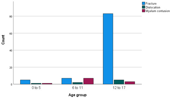 In five patients, contusion of the spinal cord without osseous injuries was found, with four on the cervical level and one on the thoracic level. Three contusions occurred in the group of 6–11-year-olds, one in the group of 0–5-year-olds, and one in the group of 12–17-year-olds. Fractures were most prevalent in the group of 12–17-year-olds, where 91.2% of patients had a fracture. The incidence was 71.4% in the group of 0–5-year-olds and 43.8% in the group of 6–11-year-olds (Figure 4).