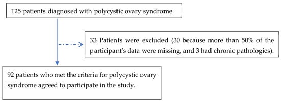 The sample selection was performed through a non-random consecutive sampling considering patients with a diagnosis of PCOS attending the gynecology and endocrinology office of the Hospital Universidad Técnica Particular de Loja (UTPL)—Santa Inés in the city of Loja (Ecuador) during the period from January 2022 to July 2023. The city of Loja is located in a region of the Andes in southern Ecuador, with an average altitude of 2200 m above sea level and a mix of ethnic backgrounds, including mestizo, indigenous, and Afro-Ecuadorian. Participants who agreed to enter the study underwent a complete medical history by health professionals, including family and personal history, and a socioeconomic survey validated by the National Institute of Statistics and Census (INEC). The women included in the study were between 18 and 40 years of age; most of the participants studied at a university center. However, teachers, administrative staff, service personnel, and private individuals also come to this healthcare center.