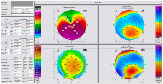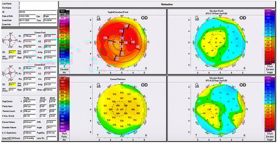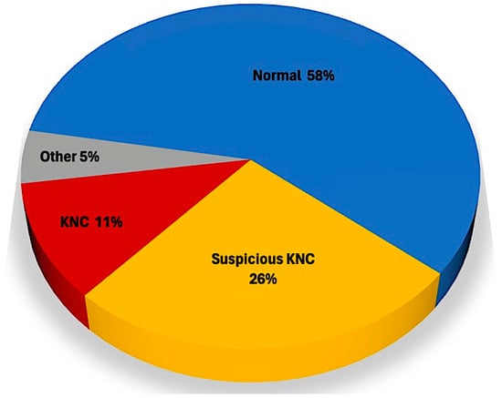 As noted above, we excluded cataract surgery candidates with an endothelial cell density under 1500 cells/mm2 and/or polymegethism, as Fuchs’ endothelial dystrophy may affect the accuracy of Scheimpflug tomographic corneal imaging captured by the Pentacam. In the residual 1250 consecutive cataract surgery cases operated for cataracts and included in this review (all other cases were eyes naïve to corneal disease) accounting for the years 2017 to 2021, we retrospectively evaluated the topographic incidence of keratoconus. Beyond the number of cases classified by the Pentacam HR (stages 1 to 4), we additionally reviewed Pentacam images of all other cases for the suspicion of keratoconus. Based on irregular pachymetry distribution, as noted in the legends of Figure 1 and Figure 2 and including the following clinical assessment principles.