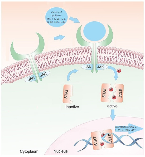 MS and signal transducer and activator of transcription 4 (STAT4) may be related since MS has been linked to immune system dysfunction [6]. Janus kinases (JAKs) are the proteins through which members of class I and class II cytokine receptor families deliver their signals. Activated JAKs phosphorylate the STATs. After phosphorylation, the STAT proteins undergo cytoplasmic dimerization before migrating to the nucleus, where they bind to deoxyribonucleic acid (DNA) regulatory elements and initiate gene transcription. The STAT signaling cascade is highly selective. A specific subset of genes dependent on STAT proteins is transcribed by any cytokine or combination of cytokines that exerts an effect [8,9]. Consequently, a variation in STAT4 expression or activity might impact the regular immune system’s response and function, resulting in immunosuppression or autoimmune disorders. STAT4 is a crucial modulator of the immunological response (Figure 1) [8]. In addition, the STAT4 gene is responsible for relaying signals from interleukin-12 (IL-12), interleukin-23 (IL-23), and interferon type 1 (INF-1) in T cells and monocytes. These signals ultimately lead to the differentiation of type 1 T helper cells and type 17 T helper cells, monocyte activation, and the production of interferon-gamma (IFN-γ) [10]. It is hypothesized that STAT4 variants may influence the occurrence and function of immune cells involved in the pathogenesis of MS [11].