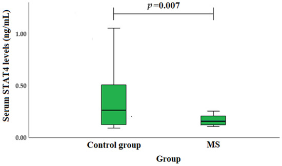 Throughout the investigation, the blood serum concentration of STAT4 in the MS patient and healthy individual groups was measured. It was found that STAT4 serum concentration was statistically significantly lower in MS patients compared with the control group (median (IQR): 0.16 (0.09) vs. 0.26 (0.42), p = 0.007) (Figure 2).