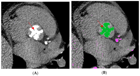 Sample images of native computed tomography showing aortic calcification with the semi-automatic detection of aortic valve calcification with an attenuation threshold of ≥130 Hounsfield units. (A): A two-dimensional representation of the aortic valve in non-contrast computed tomography. (B): A semi-automatic quantification for the Agatston calculation; green = the semi-automatic selection of the aortic valve; pink = detections of calcification at a predetermined threshold of ≥130 Hounsfield units; red arrow = aortic valve; black arrow = calcified structures such as coronary arteries.