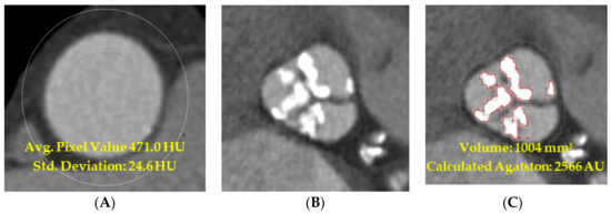 Pixel noise detection is a limiting factor in accurately identifying calcified lesions in contrast-enhanced computed tomography even with advances in protocols and techniques for improved efficacy [28,29]. A classic Agatston score is derived from 3 mm slices, thus reducing the precision of measurement of aortic valve calcification and potentially generating more noise from the surrounding structures [10]. We have chosen to add four times the standard deviation for visual improvement in contrast-enhanced imaging of items such as large vessels. Furthermore, the use of a 0.75 mm slice thickness results in a better delineation of calcified non-valvular structures even in semi-automatic quantification of the calcification of the aortic valve and its surrounding structures per our experience. In line with the mentioned publications, this led to a high level of agreement in our calculations. Further prospective studies with larger cohorts should be discussed to explore a potential prognostic use of this method.