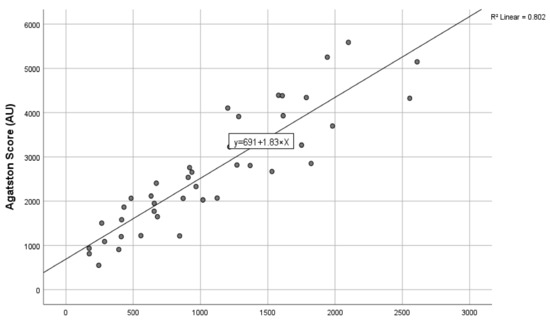 The correlation of aortic valve calcification quantification on contrast-enhanced computed tomography and the standard Agatston score on non-contrast-enhanced computed tomography with the line of best fit.
