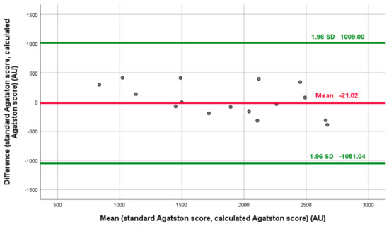 The Bland–Altman plot comparing the standard Agatston score versus the calculated contrast-enhanced imaging-derived Agatston score for aortic valve calcium quantification (p = 0.055).