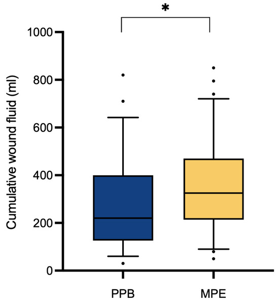 Cumulative postoperative wound fluid quantity (mL). Comparative analysis through Student’s t-test indicates a significant increase (p* = 0.0324) in the MPE cohort (n = 72) compared to the PPB cohort (n = 56).
