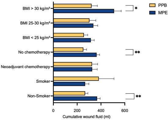 Evaluation of cumulative wound fluid quantity and risk factors. Mean and SEM of postoperative drainage volume (mL) are shown for both cohorts. Statistical significance was determined by Student’s t-test, revealing a significant reduction in postoperative wound fluid production after surgery with the PPB for those with a BMI exceeding 30 kg/m2 (p* = 0.0284), those without prior neoadjuvant chemotherapy (p** = 0.0041) and for non-smokers (p** = 0.0046). The level for statistical significance was set at * p < 0.05, ** p < 0.02.