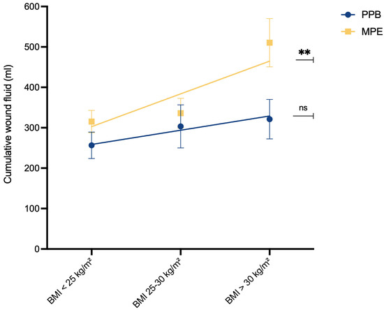 It is noteworthy that these groups typically do not share the same risk profile. In standard practice, non-smokers and patients without previous neoadjuvant chemotherapy are typically regarded as low-risk individuals for surgical complications. Conversely, patients with a BMI exceeding 30 kg/m2 are commonly perceived as a high-risk population for adverse events in the surgical context [36]. Mani et al. previously investigated the association between BMI and the occurrence of donor-site seroma following the harvesting of DIEP flaps. Their findings revealed that obese patients (BMI > 30 kg/m2) had the highest incidence of postoperative seroma formation, reaching a rate of 16% [16]. Our results revealed a significant association between higher BMI and increased postoperative wound fluid production (p** = 0.0058) within the MPE cohort (Figure 4). In contrast, no such correlation was evident within the PPB cohort (pns = 0.2895), suggesting that the utilization of PPB might mitigate the risks associated with higher BMI.