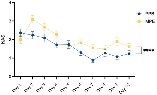 Comparative evaluation of postoperative pain. Mean and SEM for Numeric Analog Scale (NAS) assessment over a 10-day postoperative period. Statistical significance was determined by 2-way ANOVA: p**** < 0.0001, demonstrating a notable reduction in postoperative pain within the PEAK PlasmaBlade (PPB) group.