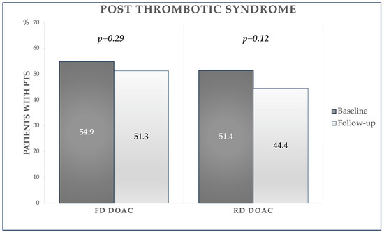 PTS was investigated in the FD and RD groups, and the variation of the Villalta score was evaluated at baseline and the last available follow-up.