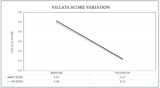 Villalta Score variation in Full Dose (FD) and Reduced Dose (RD) group from baseline to follow-up. DOACs: Direct Oral Anticoagulants.