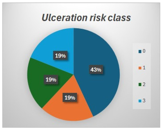 According to the IWGDF risk classification, patients were divided as follows: 43% in class 0, 19% in class 1, 19% in class 2 and 19% in class 3. As expected, the patients in class 0 were more than those belonging to classes 1, 2 and 3, which had a homogeneous distribution (Figure 1).