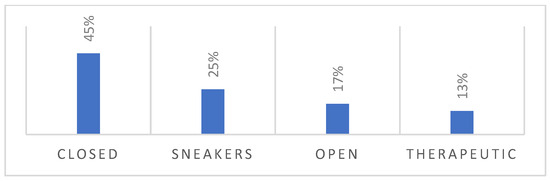 According to the survey, 45% of the patients observed wore off-the-shelf closed footwear, 25% off-the-shelf sneakers and 17% off-the-shelf open footwear. Only 13% wore TF (Figure 3 and Figure 4).