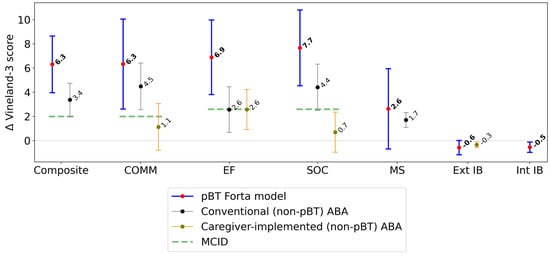 Mean change in Vineland-3 scores (95% confidence intervals), between baseline (pre-pBT-delivered ABA) and follow-up (post-pBT-delivered ABA). Δ = change in Vineland-3 score; Composite = Adaptive Behavior Composite; COMM = communication; EF = executive functioning; SOC = socialization; MS = motor skills; IB = interfering behavior; Ext = externalizing; Int = internalizing; MCID = minimal clinically important difference [,]. Improvement is defined as an increase in the Vineland-3 score (positive score change) for Composite, COMM, EF, SOC, and MS; and a decrease in the Vineland-3 score (negative score change) for Ext IB and Int IB.